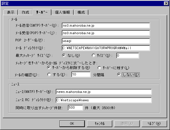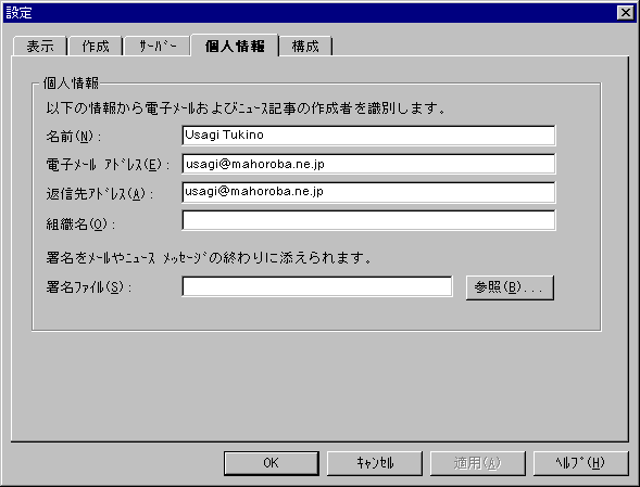 ◎文中の例では、ユーザIDを"usagi"、氏名を"Usagi Tukino"、接続名を"mahoroba"として説明しています。