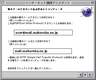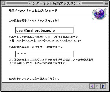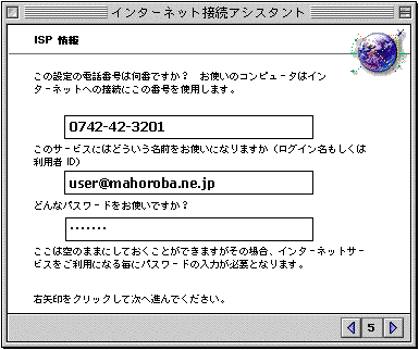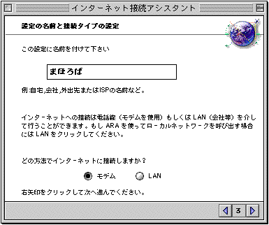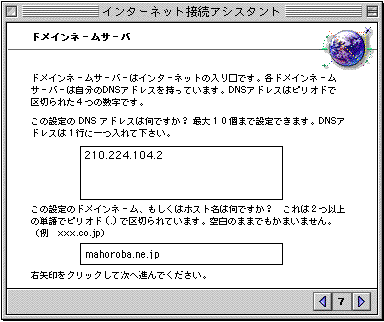 「この設定のDNSは何ですか?...」→「210.224.104.2」 「この設定のドメインネーム、もしくはホスト名は何ですか?...」→「mahoroba.ne.jp」 →【右矢印】クリック