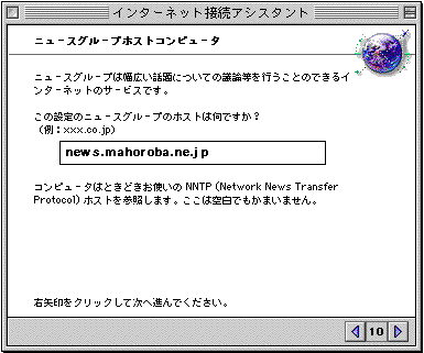 「この設定の電子ニュースグループのホストは何ですか?...」→「news.mahoroba.ne.jp」 →【右矢印】クリック