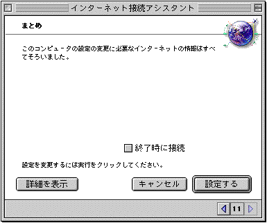 「どの様なモデムをお使いですか?」→お使いのモデムを選択 「ポート:」→モデムを接続しているポートを選択 「電話はトーン、パルスのどちらをお使いですか?」→回線別にあわせて選択 プッシュ回線なら「トーン」 ダイアル回線なら「パルス」を選択 →【右矢印】クリック